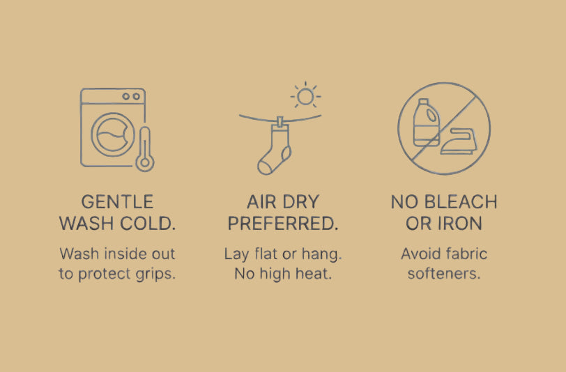 - No Softener: Fabric softener makes the grips slippery—avoid it!